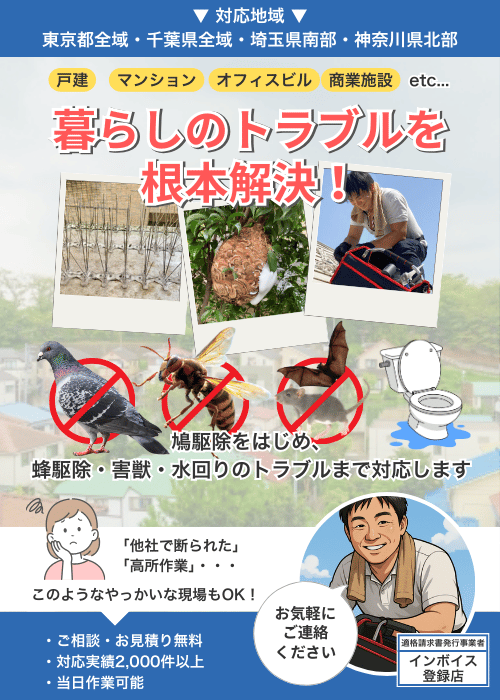 当社では、鳩駆除といった鳥害対策や蜂駆除を中心に、ネズミ・コウモリなどの害獣対策から、水まわりのトラブル対応まで、日々皆さまの「困った!」に寄り添ったサービスを提供しております。