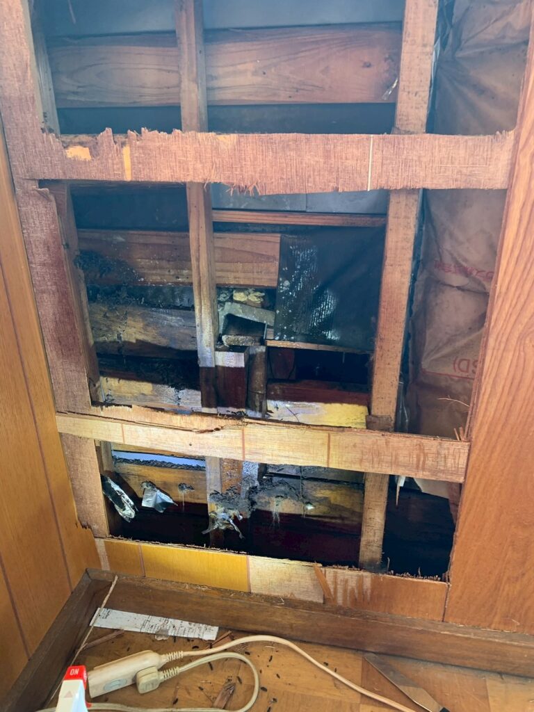 壁の板を内側から切って清掃、駆除を行いました。